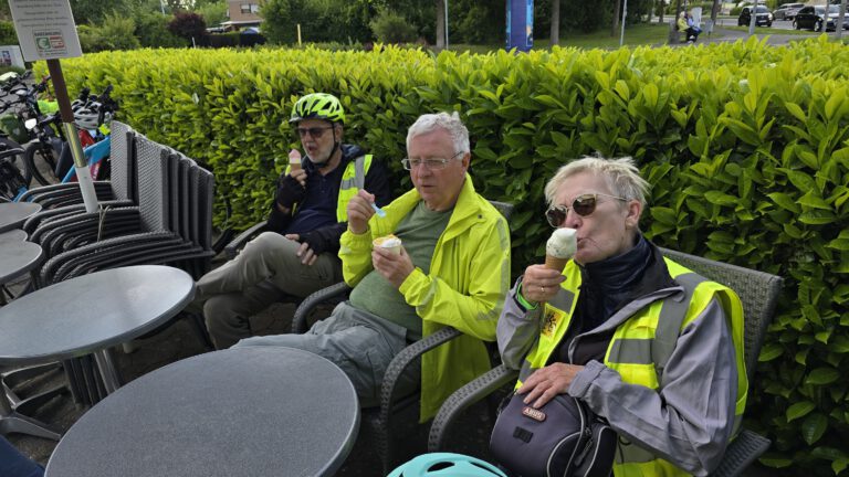 Nach der ausgiebigen Mittagspause traten wir den Rückweg an. Zunächst radelten wir auf dem gleichen Weg rheinabwärts. In Troisdorf nutzten wir erneut eine Fähre, um wieder auf die Wesselinger Rheinseite zu gelangen.Den krönenden Abschluss unserer Radtour bildete ein Besuch im Eiscafe Grimaldi in Wesseling. Bei leckerem Eis ließen wir den erlebnisreichen Tag gemütlich ausklingen. Insgesamt war die zusätzliche Radtour am 8. Mai ein voller Erfolg. Die abwechslungsreiche Strecke entlang des Rheins, die gesellige Einkehr im Gilden Brauhaus und das abschließende Eisessen trugen zu einem schönen und entspannten Fahrraderlebnis bei.