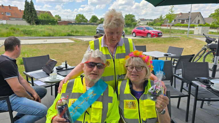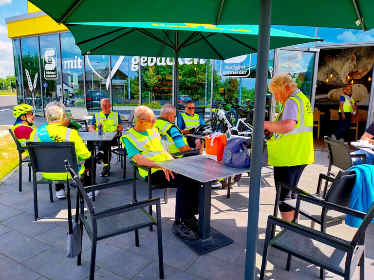 Die Weiterfahrt führte wieder durch die abwechslungsreiche Feldlandschaft des Vorgebirges. Nach einiger Zeit erreichte die Gruppe einen Baumarkt, dessen Cafeteria zu einer willkommenen Pause einlud. Bei Kaffee und Brötchen konnten sich die Radfahrer stärken und die bisherigen Eindrücke austauschen. Unsere Geli hatte sich mal wieder was ausgedacht und so wurde beim Kaffeetrinken das Maikönigspaar ermittelt.